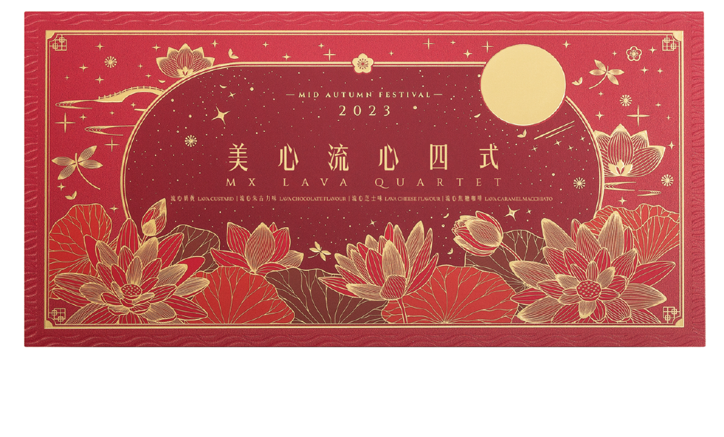 流心朱古力月饼︰与法国Cacao Barry合作,采用100%纯可可粉,醇香绵密的朱古力月饼皮与流心朱古力内馅,将朱古力味道升华到**。